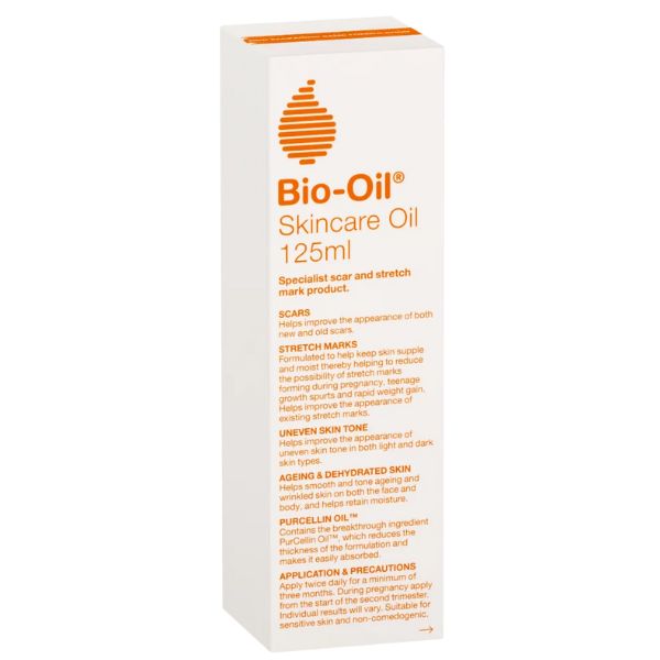 Bio-Oil Skincare Oil 125mL is a specialist skincare solution formulated to improve the appearance of scars, stretch marks, uneven skin tone, aging, and dehydrated skin. Its unique blend of vitamins A and E, along with plant extracts like calendula, lavender, rosemary, and chamomile oils, is suspended in a non-greasy oil base enhanced with PurCellin Oil™ for rapid absorption. Clinically proven and dermatologist-recommended, this hypoallergenic oil is suitable for all skin types, including sensitive skin, and can be used on both the face and body. Regular application helps to hydrate the skin, improve elasticity, and promote a more even skin tone.