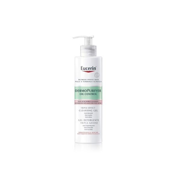 Eucerin DermoPurifyer Triple Effect Cleansing Gel is a dermatologist-formulated cleansing gel designed for acne-prone, oily, and blemish-prone skin. Ideal for use on both the face and body—including the chest, back, and shoulders—it combats breakouts, fades post-acne marks, and controls shine in one effective formula.