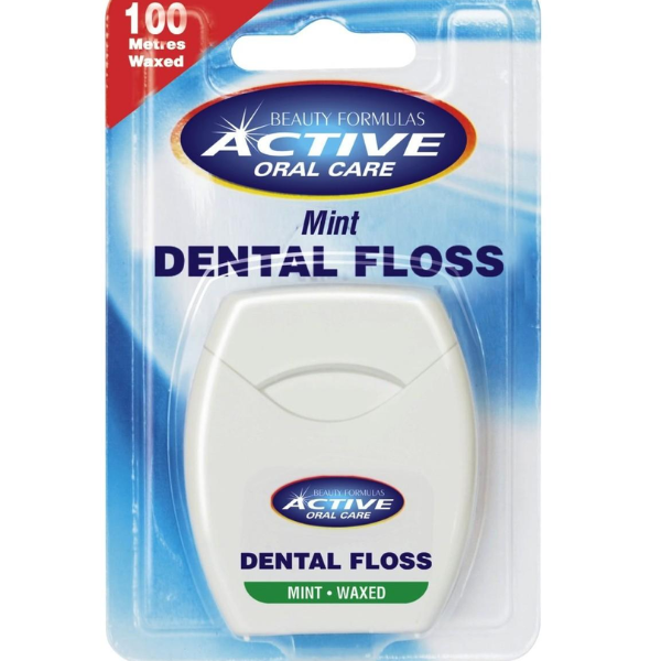 Beauty Formulas Active Oral Care Waxed mint dental floss is a mint-flavored, wax-coated nylon floss infused with fluoride. Designed to gently glide between teeth, it effectively removes plaque and food debris from areas a toothbrush cannot reach, helping maintain oral hygiene and fresh breath.