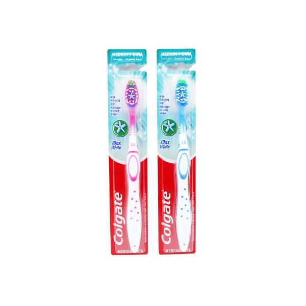 The Colgate Max White Medium Toothbrush is designed to gently polish and remove surface stains, helping to reveal your teeth’s natural whiteness. It features a unique Polishing Star bristle arrangement and multi-level bristles engineered to reach between teeth and along the gum line for thorough cleaning. The ergonomic handle and moderate firmness make it suitable for everyday use while delivering enhanced stain-removal benefits.