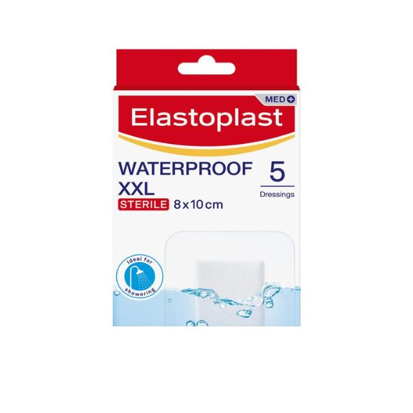Elastoplast Sterile Waterproof XXL Dressings (5 Pack) are designed to provide reliable, waterproof protection for larger or post-operative wounds. Each dressing measures 8 x 10 cm and features a flexible, breathable film that ensures a secure seal around the wound, effectively blocking out dirt and bacteria. The highly absorbent, non-stick wound pad cushions the injury without adhering to it, promoting comfort during wear and easy removal. These latex-free dressings are ideal for use during activities such as washing, showering, bathing, and swimming, thanks to their strong adhesion and waterproof properties. Suitable for sensitive skin, they offer a skin-friendly solution for wound care. Always read the label and follow the directions for use.