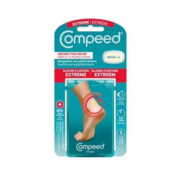 Compeed Extreme Blister Plasters (5 Pack) are specially designed to provide instant pain relief and cushioning for severe blisters. Featuring advanced hydrocolloid technology, these plasters create a protective barrier that helps speed up healing while preventing further friction. The extra-strong adhesive ensures long-lasting wear, even during intense activity. Ideal for heels and other high-friction areas, they stay in place for days and reduce the risk of infection. Discreet, waterproof, and highly effective.