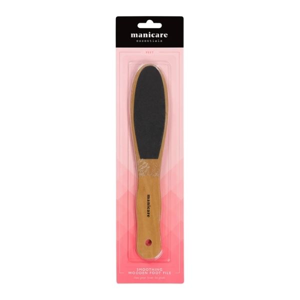 The Manicare Smoothing Wooden Foot File is a durable and effective tool designed to exfoliate rough, dry, and callused skin on the feet. Crafted with a sturdy wooden handle for comfortable grip and control, it features a dual-sided surface for both coarse and fine buffing. Ideal for regular foot care, it leaves your feet feeling smooth, soft, and refreshed. Suitable for use on dry or damp skin.