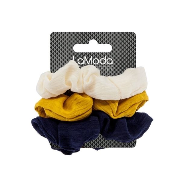 Elevate your everyday look with the Mustard Navy Cream Scrunchie Set. This trio of fabric scrunchies features a stylish blend of rich mustard, classic navy, and soft cream tones—perfect for adding a pop of color to any hairstyle. Made from soft, gentle fabric, these scrunchies help prevent breakage and creases, making them ideal for all-day wear. Whether you're styling a ponytail, bun, or half-up do, each scrunchie offers a secure yet comfortable hold with a chic, effortless finish. A must-have set for versatile, hair-friendly styling.
