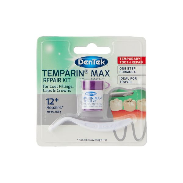 DenTek Temparin Max Advanced Dental Repair Kit is a convenient, dentist-recommended solution designed to temporarily repair lost fillings, caps, crowns, or inlays until professional dental care can be obtained. The kit includes a ready-to-use material that requires no mixing, making it ideal for at-home use during dental emergencies. With ingredients commonly used by dental professionals, it provides a secure hold and can be used for multiple applications.