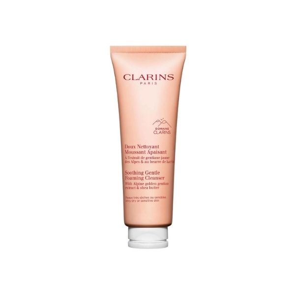 Cleanse and comfort your skin with Clarins Soothing Gentle Foaming Cleanser, specially formulated for dry or sensitive skin types. This creamy, water-activated cleanser transforms into a silky, naturally lathering foam that effectively removes makeup, impurities, and pollution—without stripping the skin. Free from soap and SLS, it helps maintain a healthy skin microbiota while leaving your complexion soft, smooth, and soothed. Infused with plant-based ingredients from Le Domaine Clarins, including Organic Saponaria for gentle foaming, Organic Chamomile, and nourishing Shea Butter, this cleanser offers a luxuriously calming cleanse. The Gentle Complex—featuring Organic Golden Gentian and Lemon Balm—further softens and protects for a truly gentle cleansing ritual. Perfect for very dry or sensitive skin.