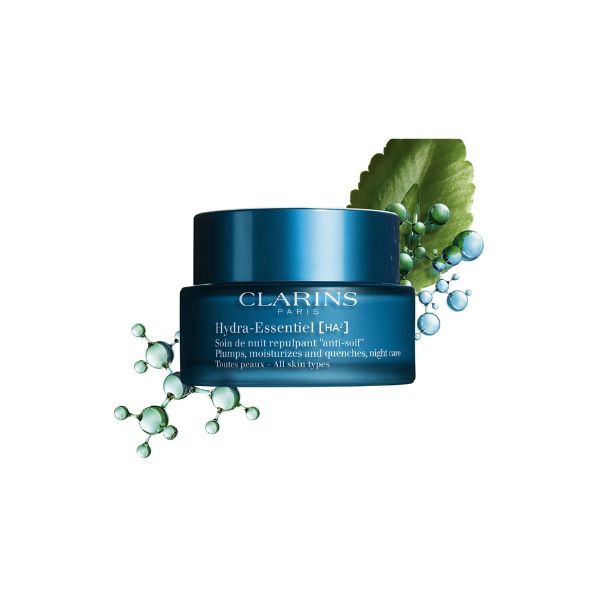 Clarins Hydra-Essentiel [HA²] Night Cream 50ml is a deeply hydrating night cream formulated to replenish and plump dehydrated skin. Enriched with Clarins' Hyaluronic Power Complex—a combination of high and low molecular weight hyaluronic acids—and organic leaf of life extract, it boosts the skin's natural hydration mechanisms and preserves moisture reserves. Plant-based squalane reinforces the skin's hydrolipidic film, while line-filling pearls visibly smooth dehydration lines. Its airy, creamy texture melts instantly into the skin, leaving it radiant and refreshed upon waking. Suitable for all skin types, this night cream helps restore skin's suppleness and comfort overnight.